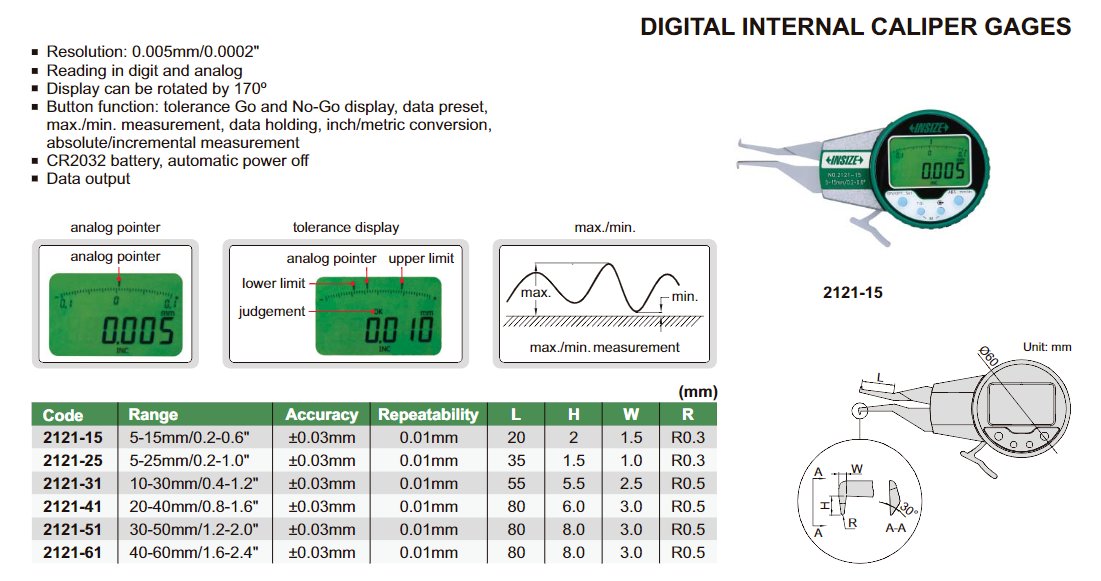 INSIZE 2121-31 digitální úchylkoměr s rameny pro vnitřní měření 10-30mm/0,4-1,2"