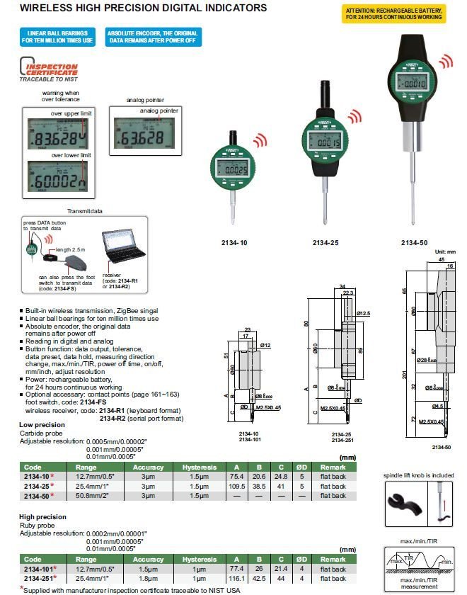 INSIZE 2134-10 digitální úchylkoměr WI-FI MEGAPRECISION 12,7mm/0,5″ / 0,01 až 0,0005 / 3µm