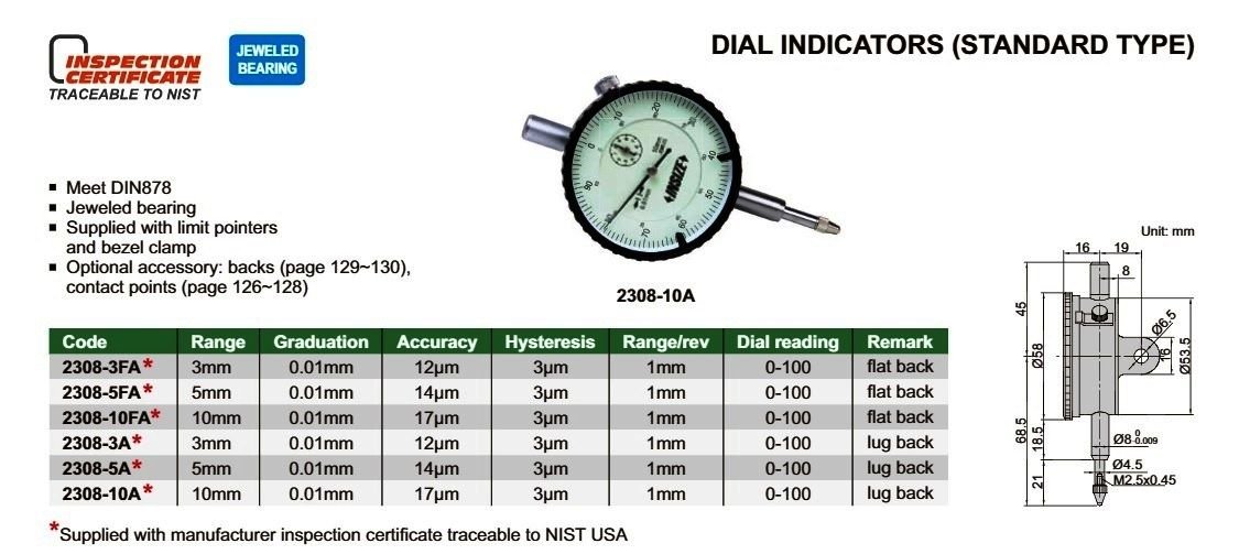 INSIZE 2308-5A Číselníkový úchylkoměr 5mm / 0,01mm ( s ouškem )