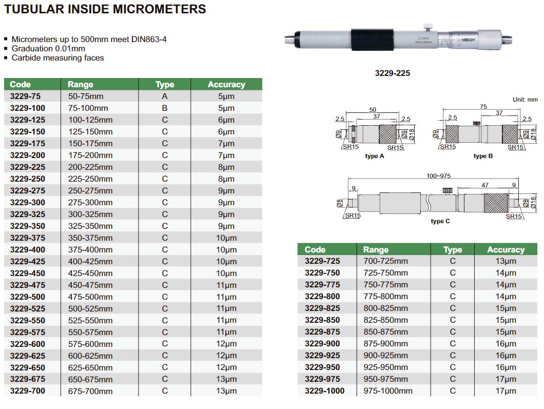 INSIZE 3229-925 Přesné dvoudotekové mikrometrické odpichy 900-925mm / 0,01mm