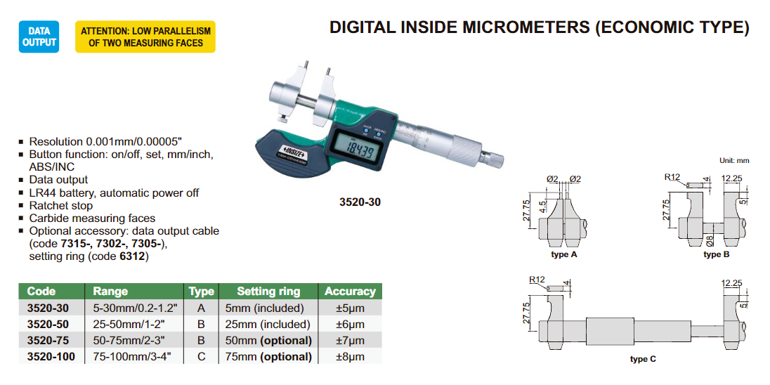 INSIZE 3520-100 digitální vnitřní mikrometr 75-100mm, odměřování 0,001mm / 0,00005\"