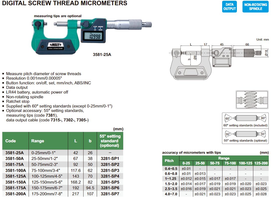 INSIZE 3581-75A digitální mikrometr na měření závitů 50-75mm / 0,001mm
