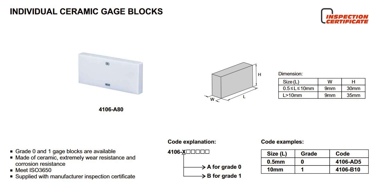 Koncové měrky INSIZE 4106-B …. písmeno "B" v kódovém označení určuje třídu přesnosti. "B" = třída přesnosti 1.