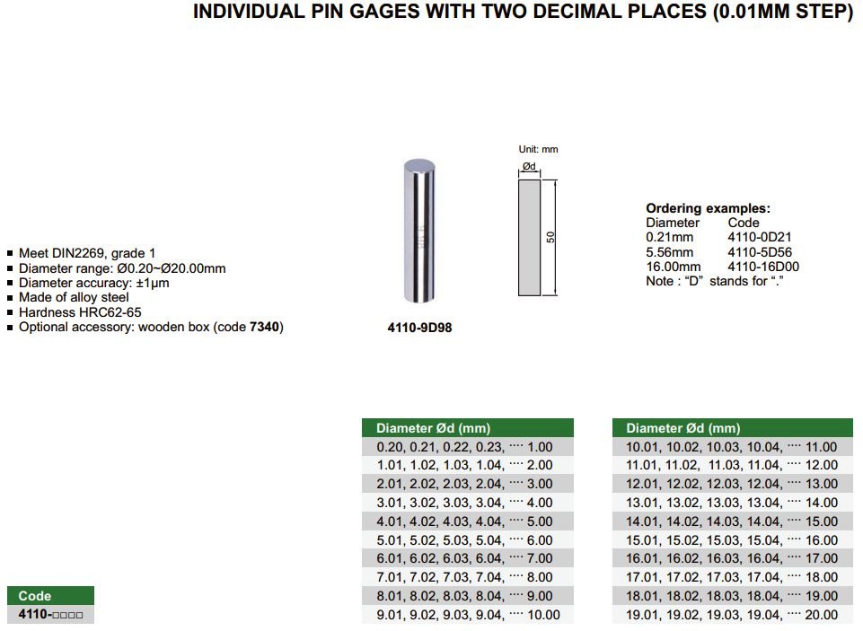 Válečkové měrky 4110 jsou dodávány ve standardních katalogových rorměrech v rozsahu 0,2 až 20mm.