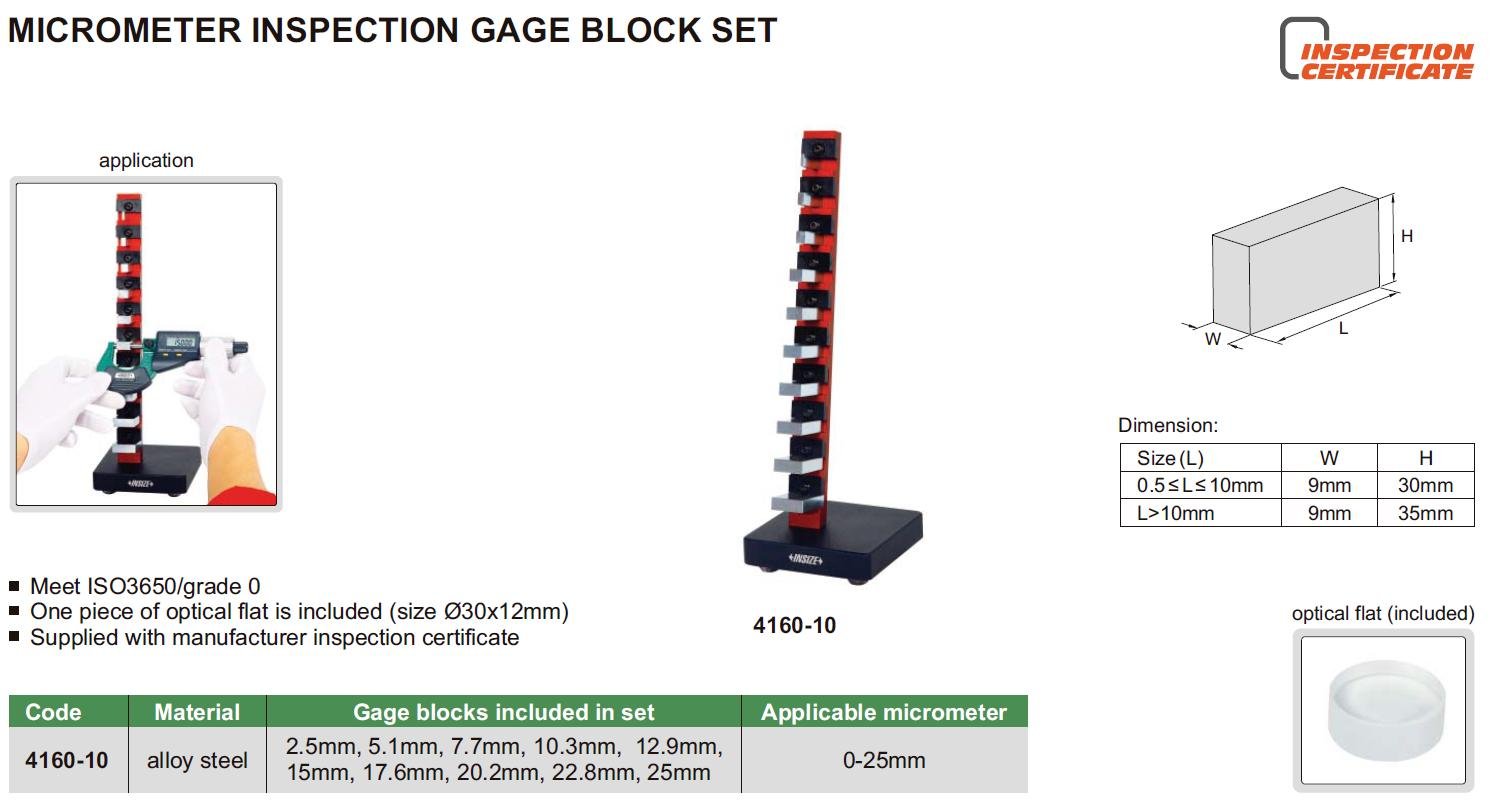 INSIZE 4160-10 sada měrek ve stojanu pro kontrolu mikrometrů 0-25mm