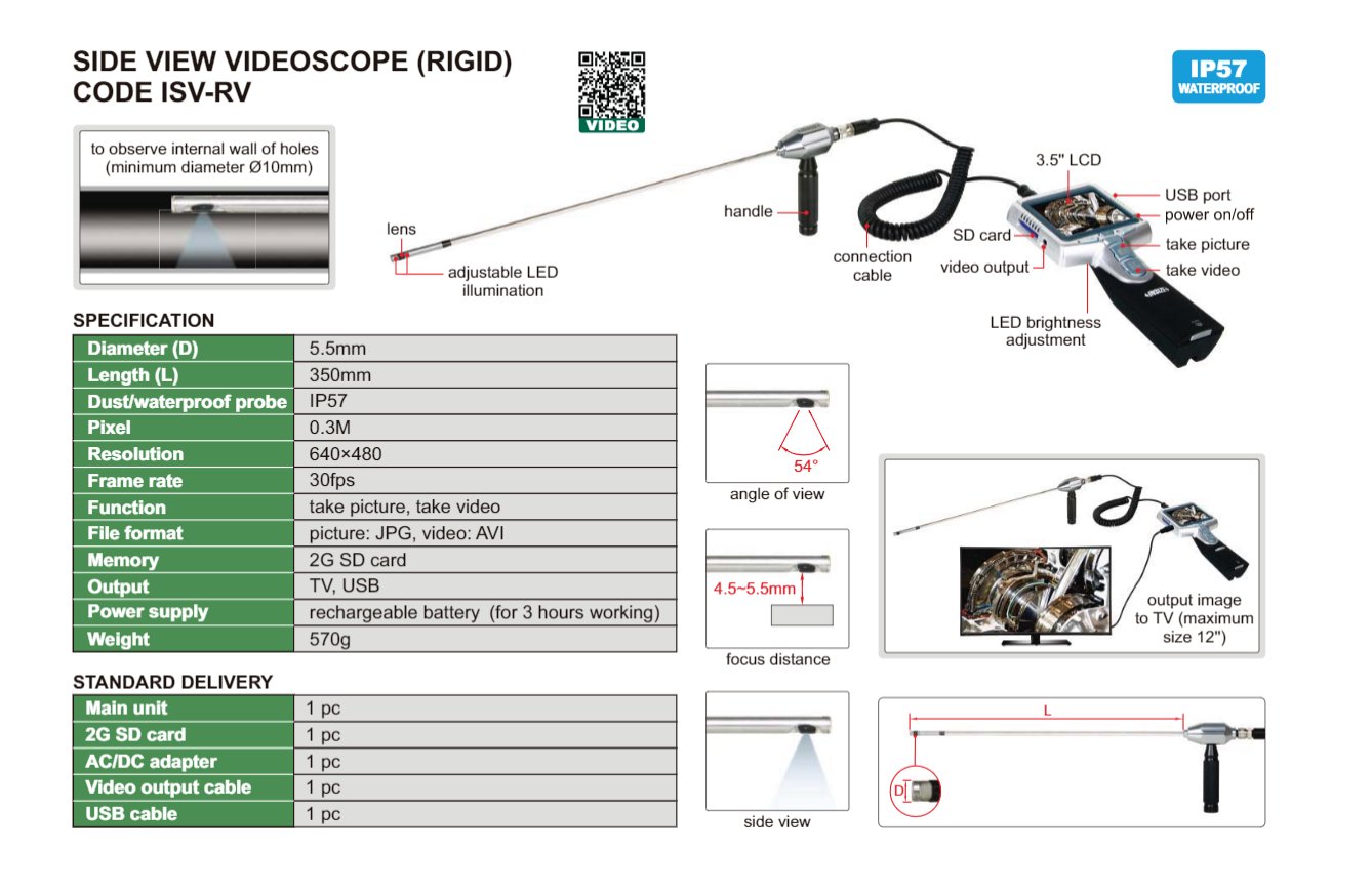 Endoskop ISV-RV INSIZE s bočním pohledem, stupněm ochrany IP57, s průměrem čočky 5,5 mm a rozlišením 640x480. Kamera 0,3M pixelů Rozlišení 640x480 Snímková frekvence 30fps Pořizování obrázků (JPG) a videí (AVI) Pamět 2G SD karta Výstup pomocí TV, USB Délka 350 mm Více