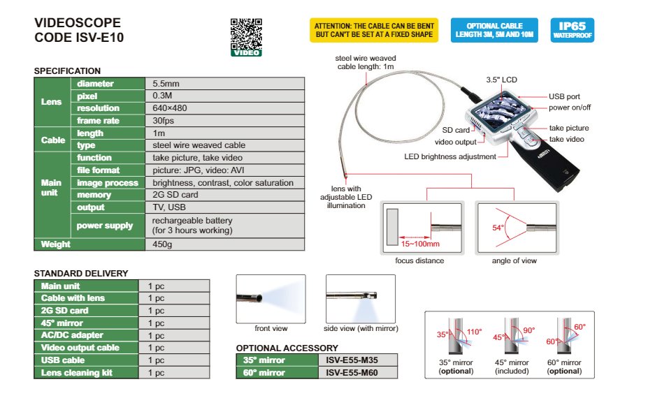 Endoskop ISV-E10 INSIZE s rozlišením 640x480, průměrem čočky 5,5 mm a typem ochrany IP65.