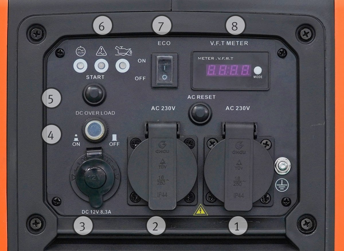 - Kontrolky výstupního napětí, přetížení a nedostatku oleje