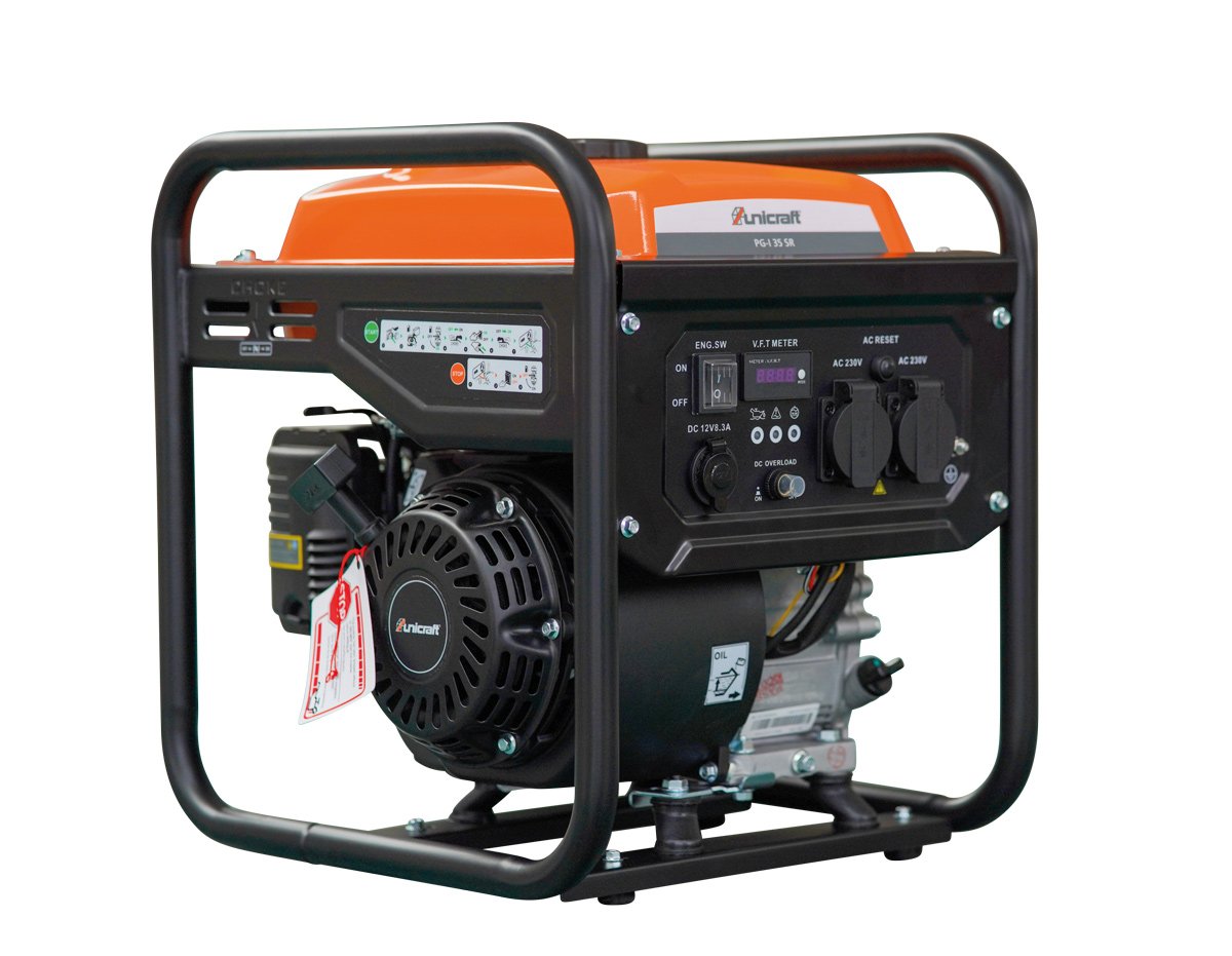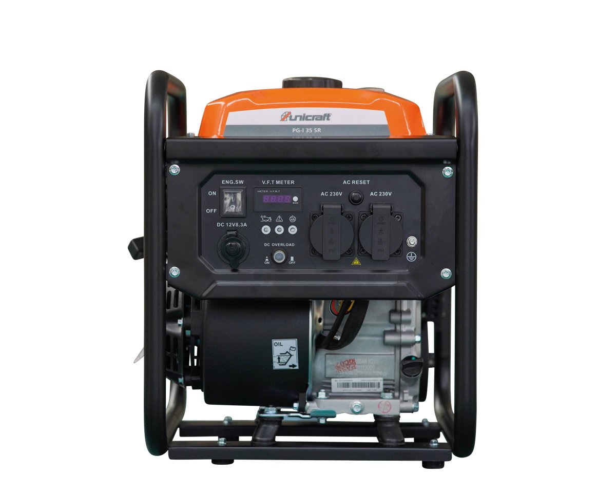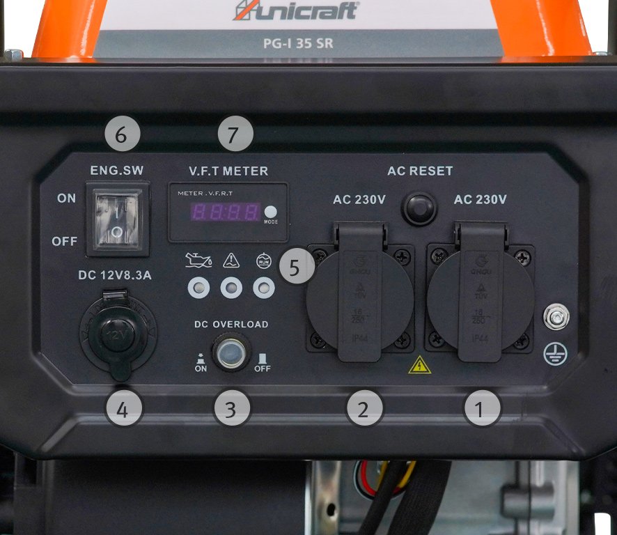 - Kontrolky výstupního napětí, přetížení a nedostatku oleje