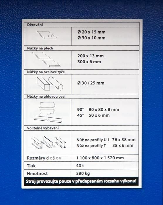 | Děrování | Tlak: 40 t<br>Ø v max. tloušťce plechu: Ø 20 × 15 mm / Ø 30 × 10 mm<br>Vyložení: 175 mm<br>Zdvih: 50 mm<br>Zdvihů za minutu: 20 <br>Pracovní výška děrovačky: 970 mm |