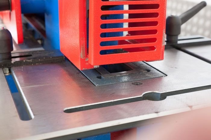 | Stříhání plechu | Max. tloušťka materiálu: 200 × 15 mm<br>Max. velikost materiálu: 300 × 12 mm<br>Délka nože: 316 mm<br>Střih pod úhlem: 80 × 10 mm<br>Pracovní výška: 935 mm |
