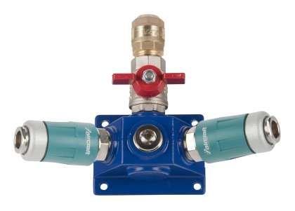 Smontované rozdělovací krabice Ø 15 – 28 mm pro montáž na strop nebo stěny 1 x rozdělovací krabice, 2 x bezpečnostní rychlospojka 1/2"AG, 1 x záslepka 1/2", 1 x kulový ventil 1/2"AG x 1/2"IG, 1 x zástrčková spojka AD 15 mosaz