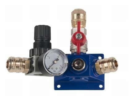 - 1 x rozdělovací krabice, 2 x rychlospojka 1/2"AG, 1 x záslepka 1/2", 1 x kulový ventil 1/2"AG x 1/2"IG, 1 x regulátor tlaku 1/4", 1 x zástrčková spojka AD 22 mosaz