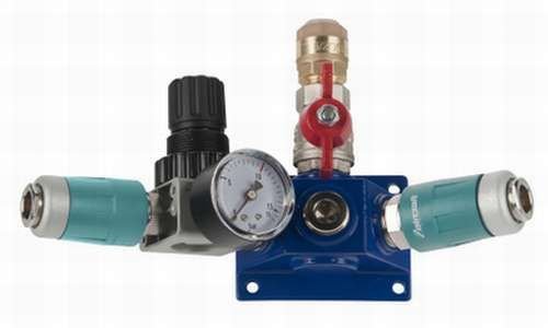 1 x rozdělovací krabice, 2 x bezpečnostní rychlospojka 1/2"AG, 1 x záslepka 1/2", 1 x kulový ventil 1/2"AG x 1/2"IG, 1 x regulátor tlaku 1/4", 1 x zástrčková spojka AD 22 mosaz