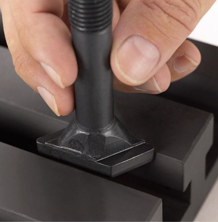 • vložení šroubu s kosočtvercovou hlavou shora do T-drážky a otočení až do dorazu v T-drážce