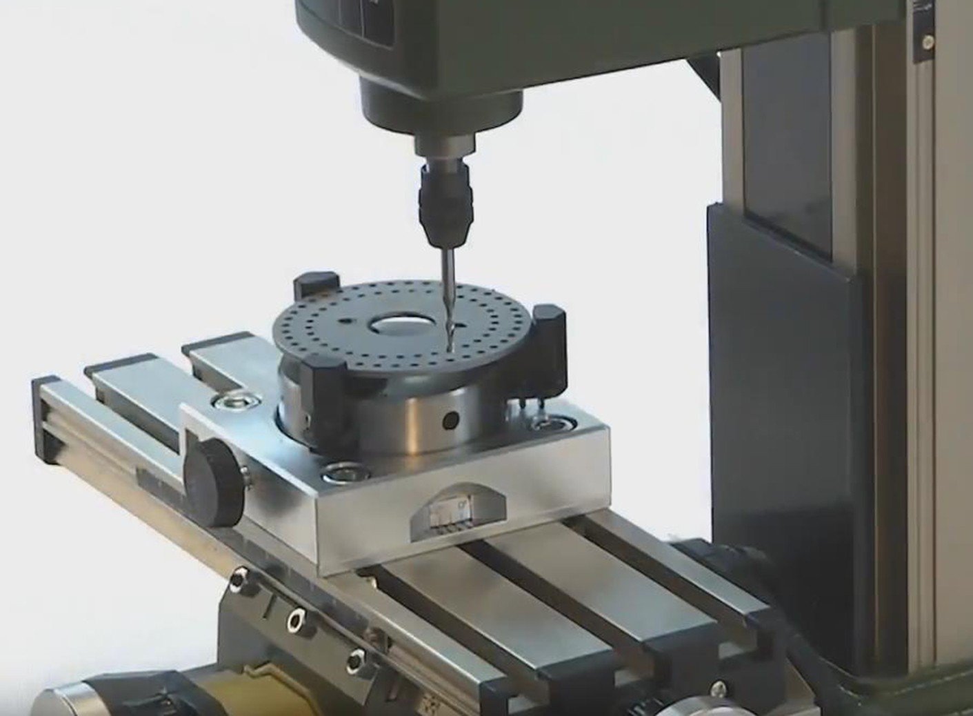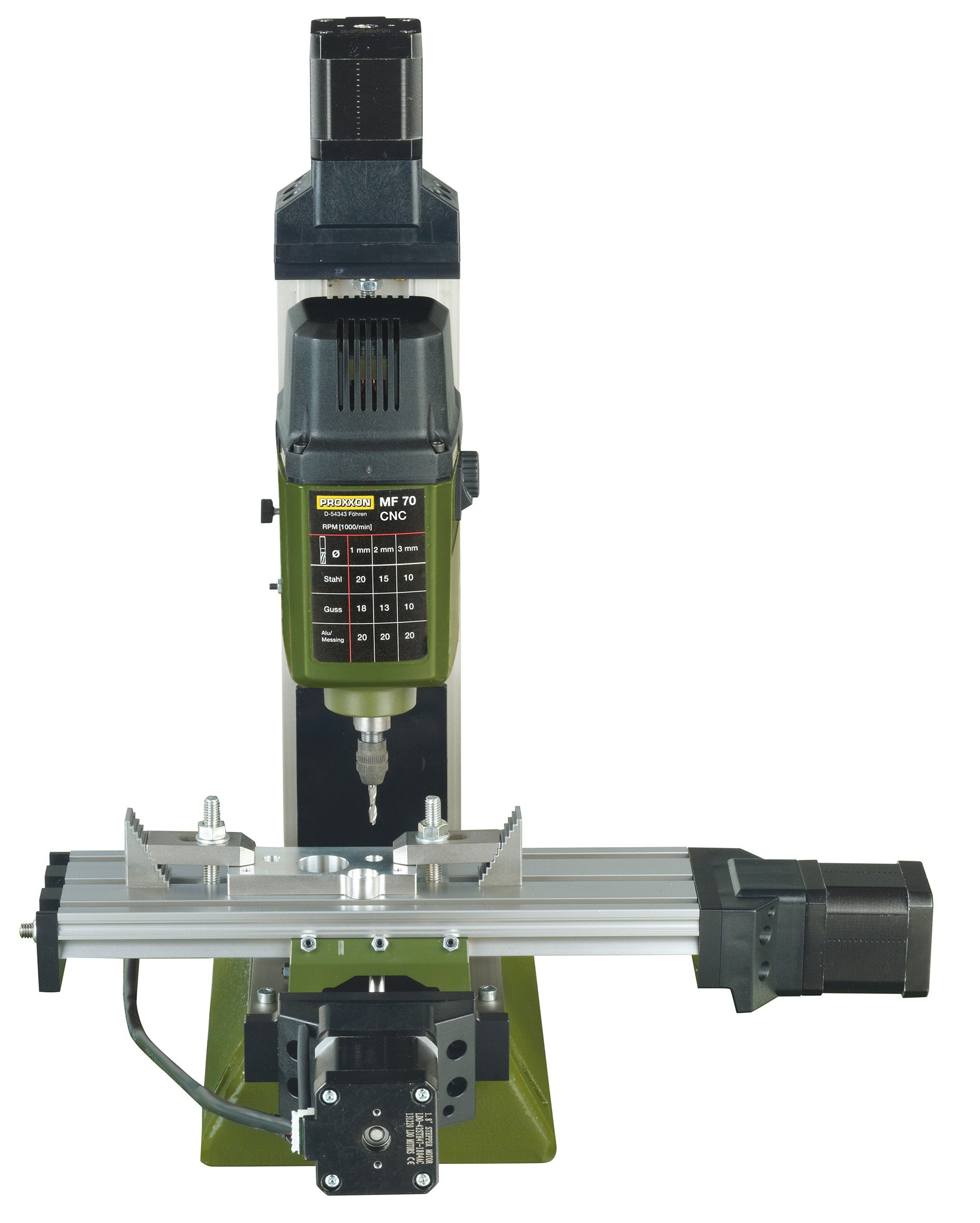 Křížový stůl (velikost 70x250mm) je vyroben z pevného hliníku se zhutněným povrchem se třemi průchozími T-drážkami (MICROMOT norma 12 x 6 x 5 mm) umožňují upnutí obrobku pomocí stupňovitých upínek, které jsou součástí dodávky.
