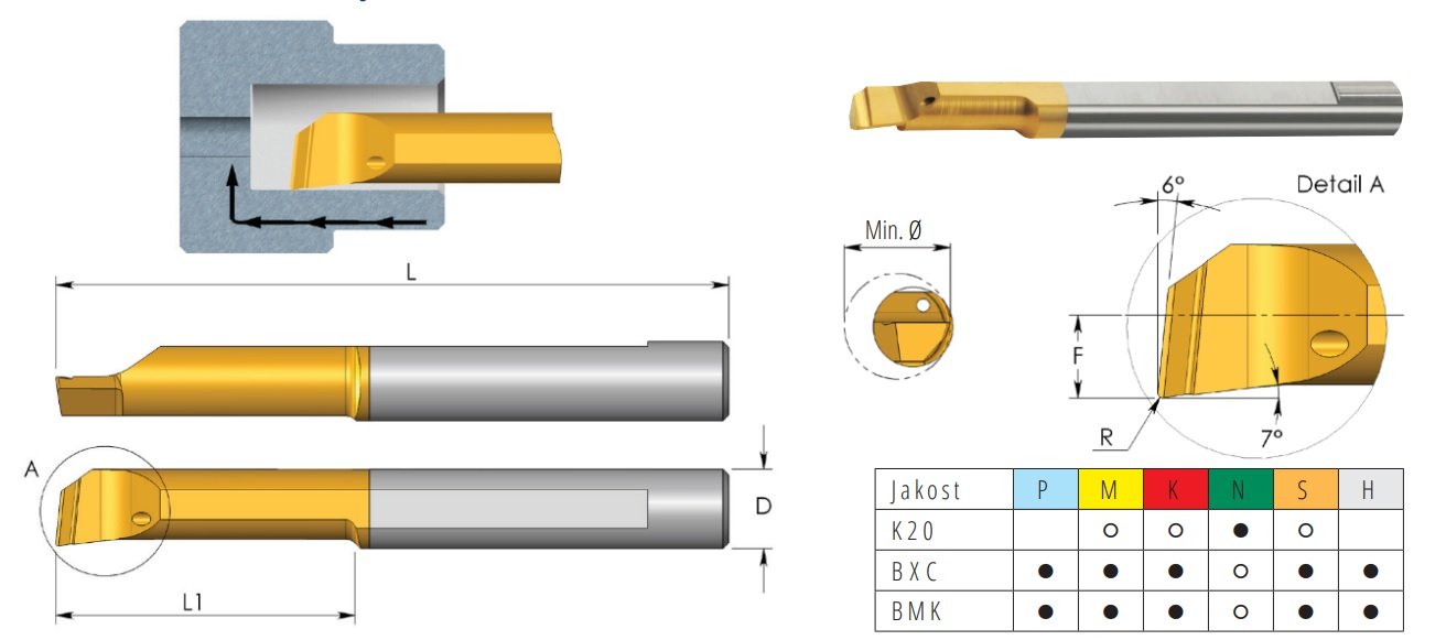 Nástroj je vyroben z jemnozrnného karbidu s třívrstvým PVD povlakem na bázi TiAlN (ISO K10-K20 / K20-K30). Extrémně vysoká teplná odolnost pro maximální výkony.