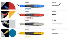 Sada čtyř EB škrabáků Sada obsahuje 4 EB rukojeti osazené čtyřmi rozdílnými noži (S10, N1, D50, CR8). Rukojeti jsou rozlišeny barevným pruhem pro lepší orientaci při práci. Nože je možno vyměňovat. Obsahuje tyto škrabáky: EB1000 (modrý) - rukojeť EB5000 osazená nožem BS1010… Více