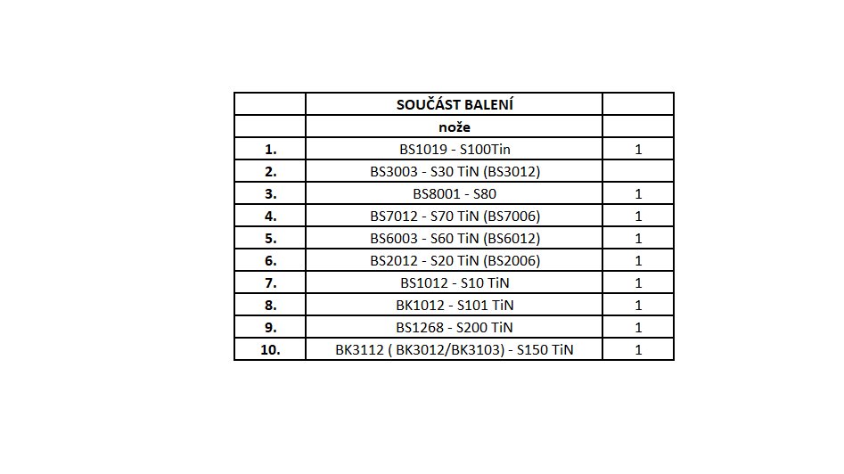 Sada 10 povlakovaných nožů TiN značených laserem. Rozměr: 95x77x48mm. Váha: 72 g.