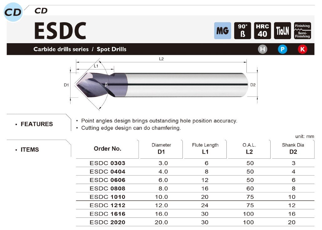 Tvrdokovové středicí vrtáky ESDC jsou určeny pro přesné středění a předvrtání otvorů v materiálech do tvrdosti 40 HRC. Optimalizovaný vrcholový úhel zajišťuje vysokou přesnost umístění otvoru, přičemž speciální geometrie břitu umožňuje také srážení hran v jednom pracovním kroku.