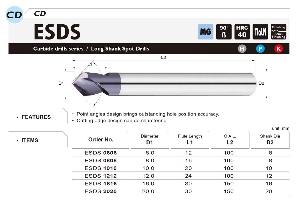 Tvrdokovové středicí vrtáky ESDS jsou určeny pro přesné středění a předvrtání otvorů v materiálech do tvrdosti 40 HRC. Optimalizovaný vrcholový úhel zajišťuje vysokou přesnost umístění otvoru, přičemž speciální geometrie břitu umožňuje také srážení hran v jednom pracovním kroku.