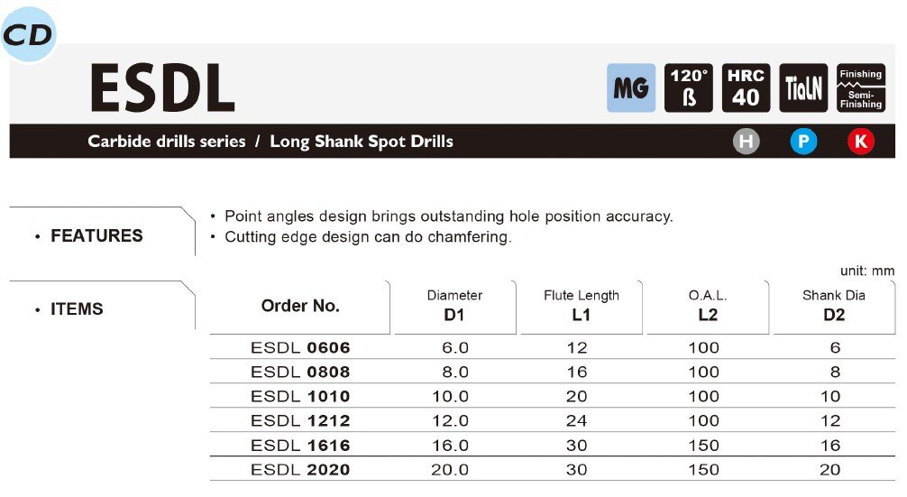 Tvrdokovové středicí vrtáky ESDL jsou určeny pro přesné středění a předvrtání otvorů v materiálech do tvrdosti 40 HRC. Optimalizovaný vrcholový úhel zajišťuje vysokou přesnost umístění otvoru, přičemž speciální geometrie břitu umožňuje také srážení hran v jednom pracovním kroku.