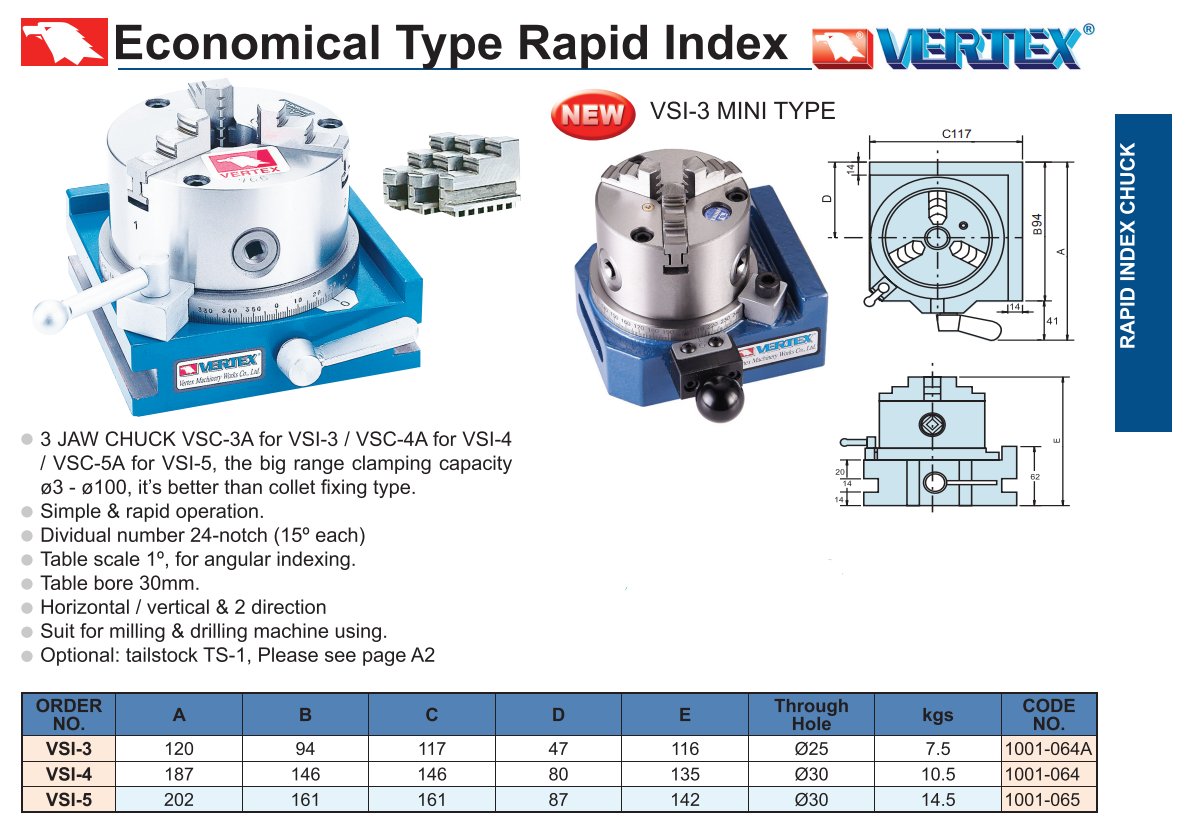 Jednoduchý dělící přístroj 3-čelisťové sklíčidlo - D 80mm (1001-067A VERTEX)Rozsah upínání vnější Ø3 - Ø70 Rozsah upínání vnitřní Ø24 - Ø64 Dělení s aretací po 15°/ 24 pozic / Plochá páčka Kulatou páčkou se stůl aretuje v dané pozici. Průchozí díra ve sklíčidle: 25mm Rozměry stolu… Více