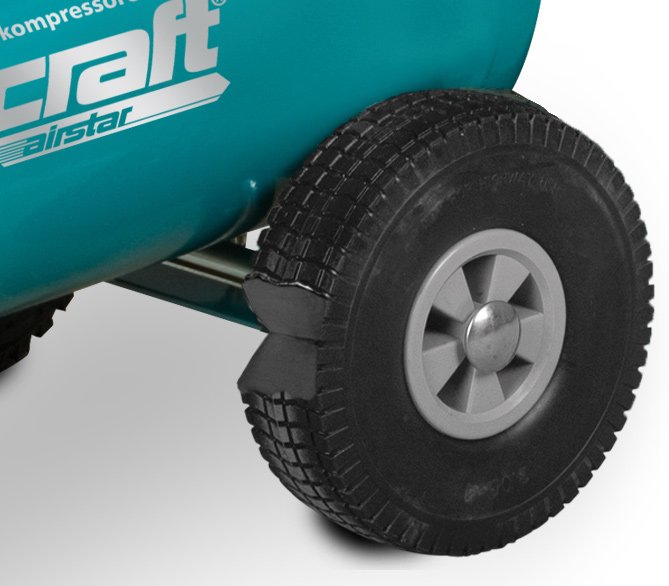 - Stabilní řiditelný podvozek s parkovací brzdou ve spojení s velkými koly z PU pěny zabraňující defektu umožňují pohodlnou přepravu bez nutnosti kompresor nadzvedávat