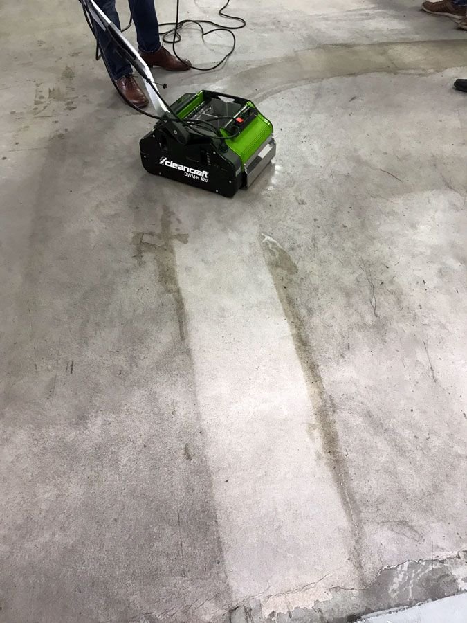 Podlahový mycí stroj se dvěma kartáči.