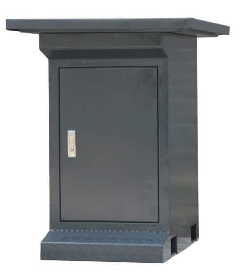 Masivní a těžký podstavec s uzamykatelnou skříňkou.