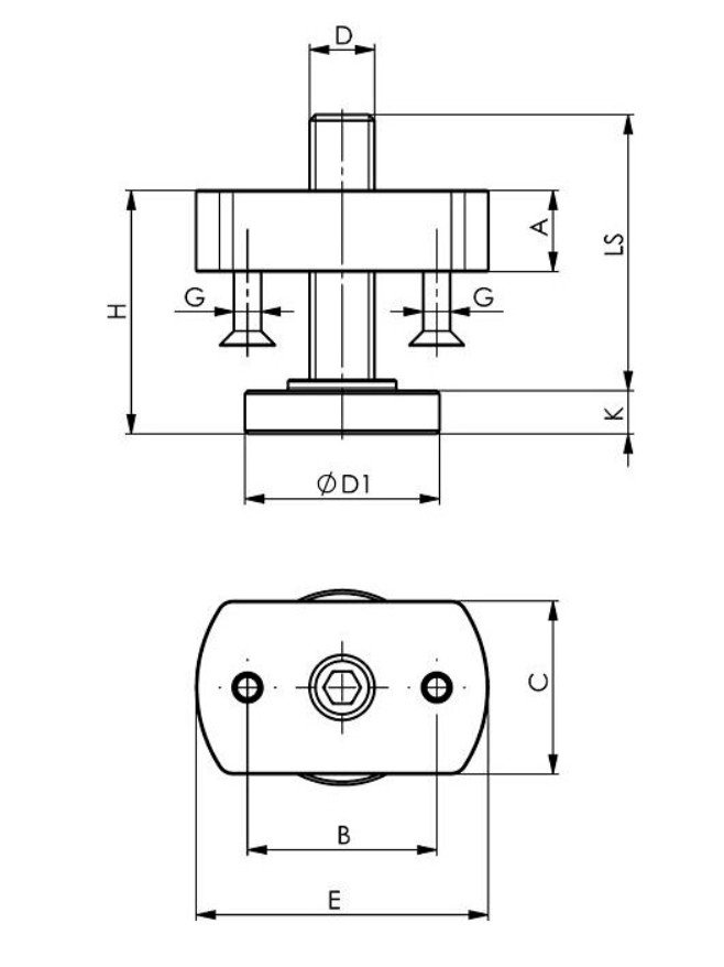 Podpěrný nástavec, ocel pozinkovaný a temperovaný, podpěrný šroub, temperovaný, třída pevnosti 8,8. Skládá se ze základny, podpěrné šrouby a upevňovacích šroubů.