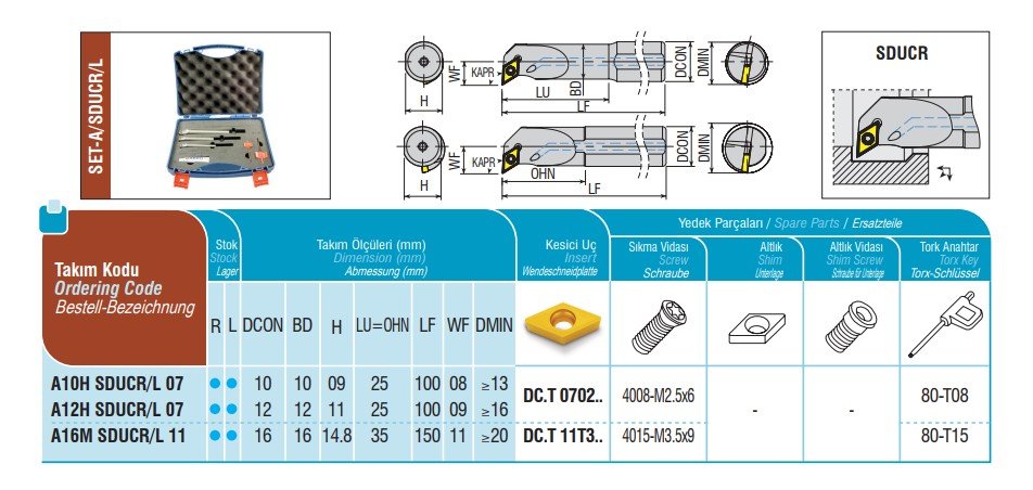 Sada vnitřních soustružnických držáků VBD typ SDUCL. Všechny držáky obsažené v sadě jsou s vnitřním chlazením pro přesný přívod chladící kapaliny do místa řezu. Sada obsahuje: A10H SDUCL 07...............1ks A12H SDUCL 07...............1ks … Více
