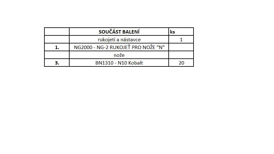 Dále obsahuje kobaltové nože BN1310 N1 (průměr 2,6mm) 20ks. Vhodný na plasty a tvrdší materiály.
