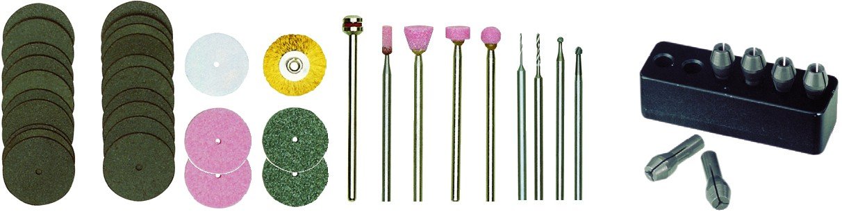 Kompletní sada na vrtání, frézování, broušení, leštění, kartáčování, čištění, odrezování, řezání, gravírování a cizelování. Na opracování oceli, ušlechtilých kovů, skla, keramiky, plastů a minerálů.