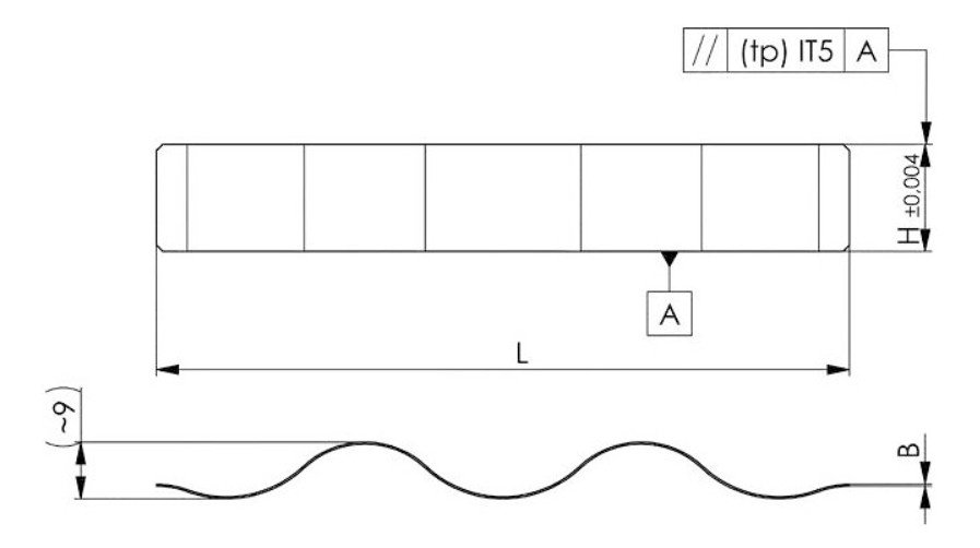 Sada vroubkovaných paralelních podložek z kalené a popuštěné pružinové oceli, přesně broušené s výškovým odstupem 2 mm. Uloženy v dřevěné krabici se sklápěcím víkem. Superpřesné provedení s tolerancí výšky páru tp dle IT 5 a rozměrovou tolerancí ±0,004 mm dle DIN ISO 2768 – m.