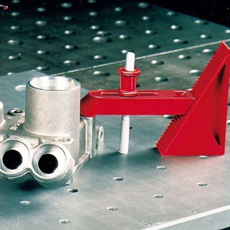 Sada různých plastových upínacích prvků, v závislosti na velikosti obsahuje: 4 × podpěrné bloky s vroubkovanými zuby, 2 × upínací čelisti s vroubkovanými zuby, 2 × dvojité upínací čelisti a 10 × matic s vroubkováním a šestihranným tvarem. Vyrobeno z vysoce pevného plastu PBT, červené barvy. Čepy z eloxovaného hliníku.
