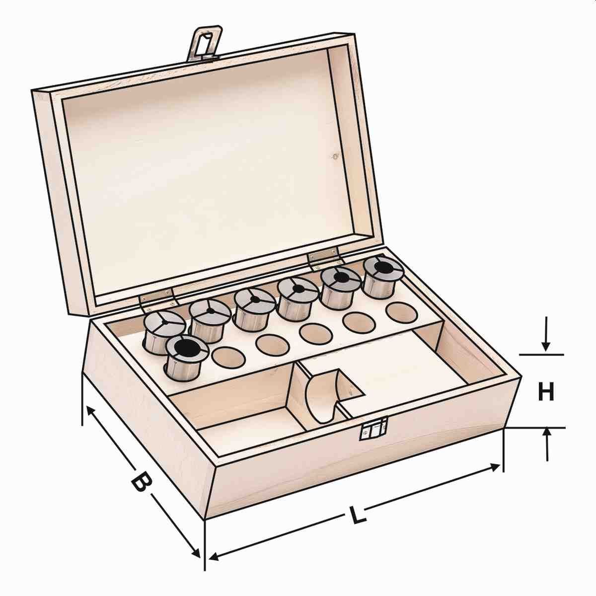 Sada redukčních pouzder pro silové upínače s těsněním 6ks v dřeveném boxu. Ø 6, 8, 10, 12, 16, 20