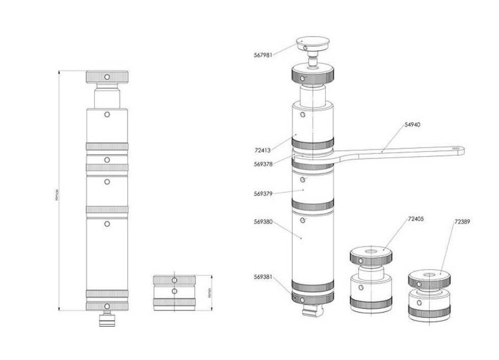 Modulární konstrukce umožňuje využití různých meziprvků a základních prvků šroubového zvedáku, které se vzájemně spojují pomocí závitu. Jednotlivé prvky se bezpečně fixují pomocí hákového klíče. S touto sadou lze dosáhnout maximální výšky 285 mm.