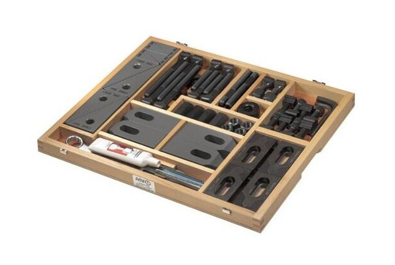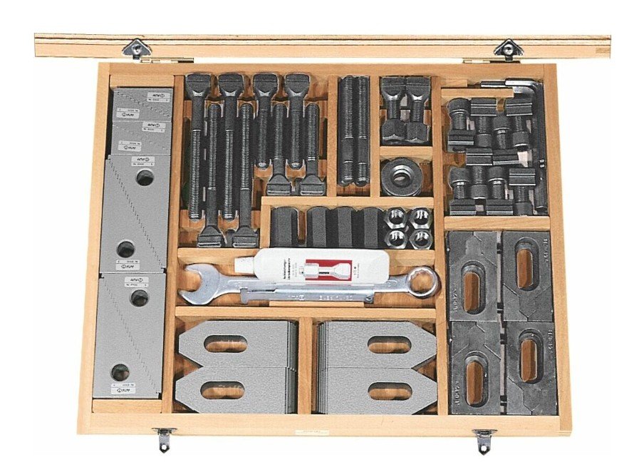 Sady upínacích nástrojů jsou určeny pro obráběcí stroje s T-drážkovými stoly a obsahují všechny prvky potřebné pro rychlé upnutí nástrojů, přípravků a obrobků. Jsou vyrobeny z zušlechtěné (kalené) oceli podle norem DIN nebo podle závodních standardů. Šroubové díly jsou v pevnostní třídě 8 a/nebo 10. Dodáváno v robustní a kvalitní dřevěné krabici s odnímatelným skládacím víkem.