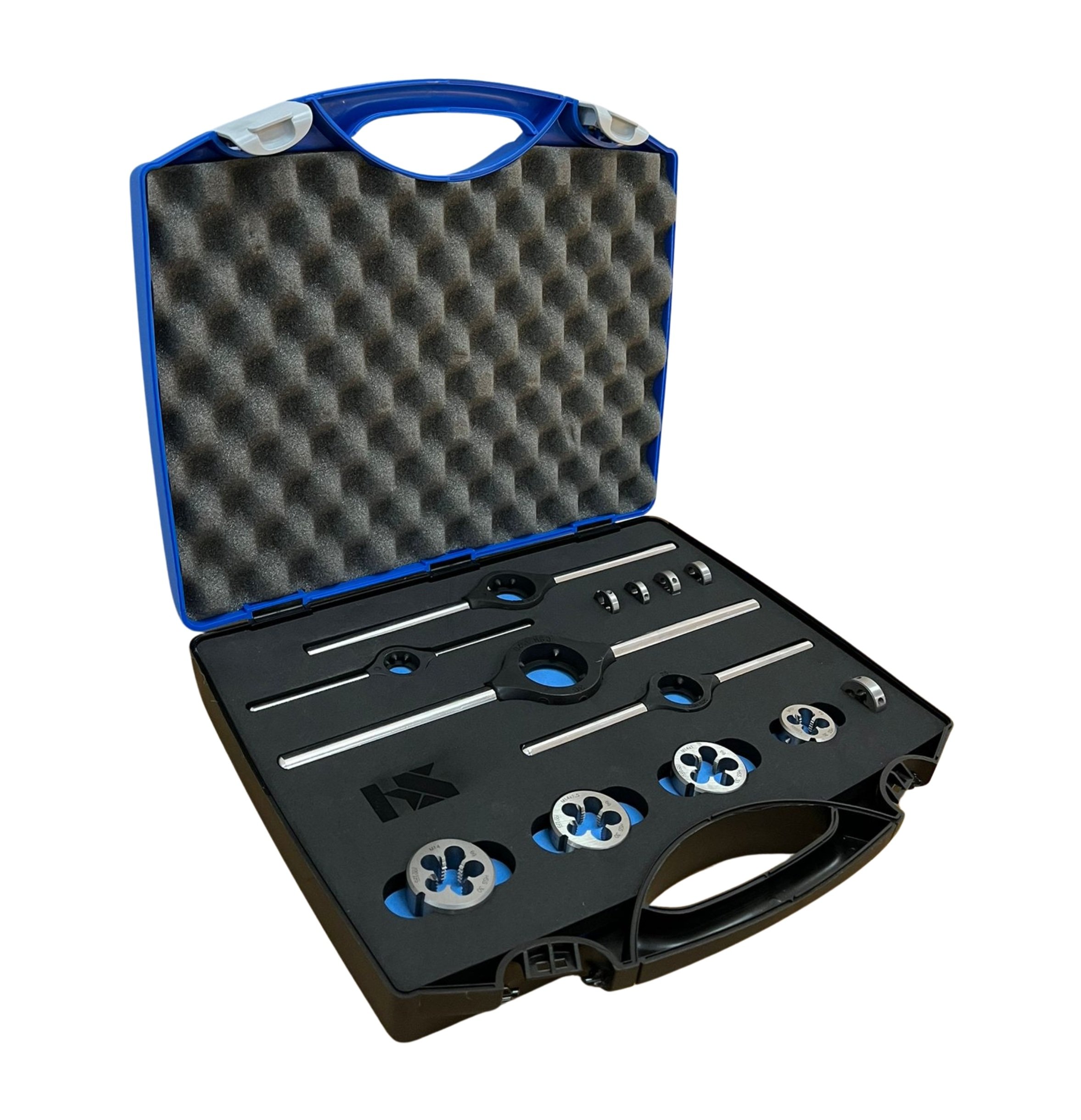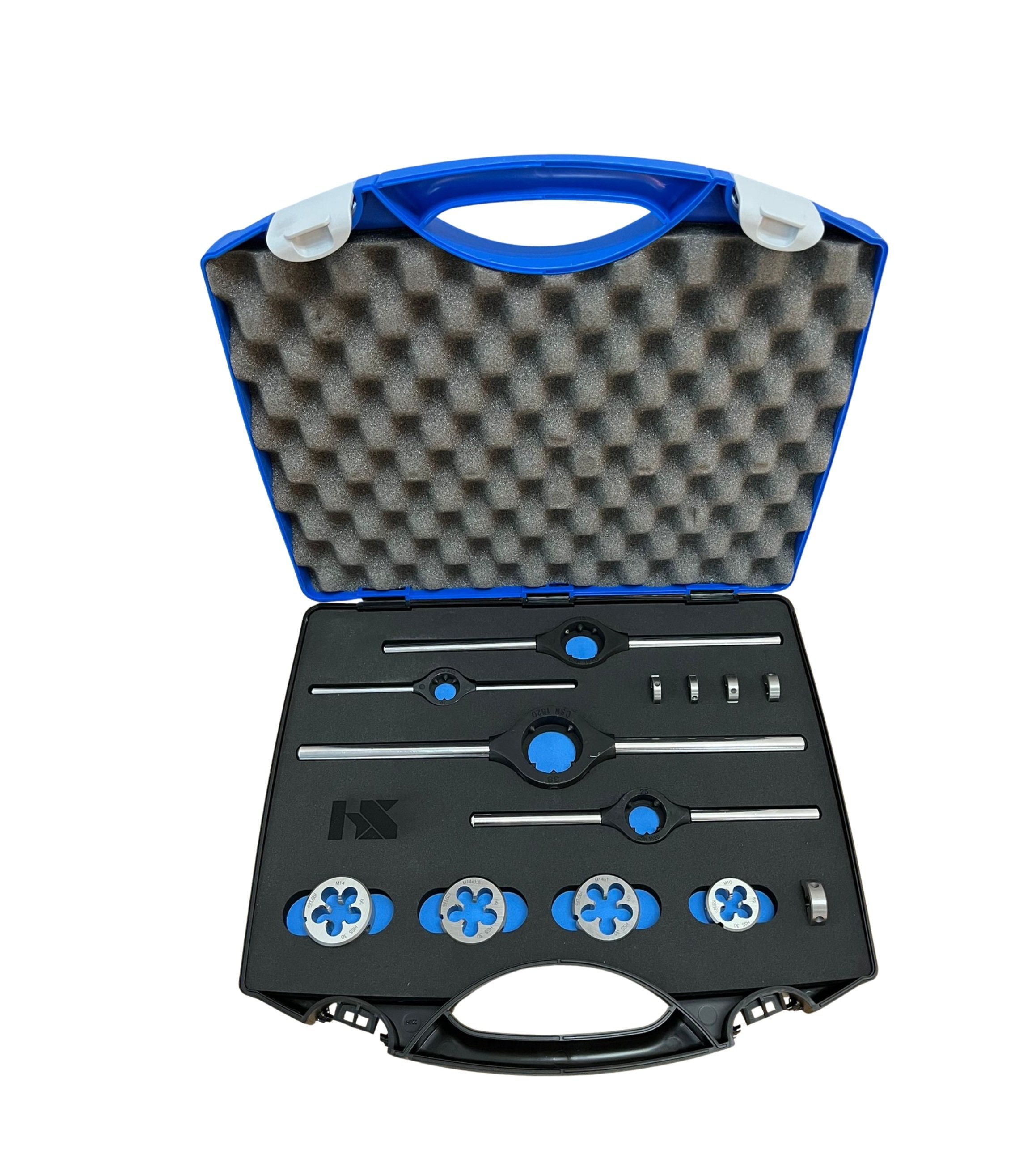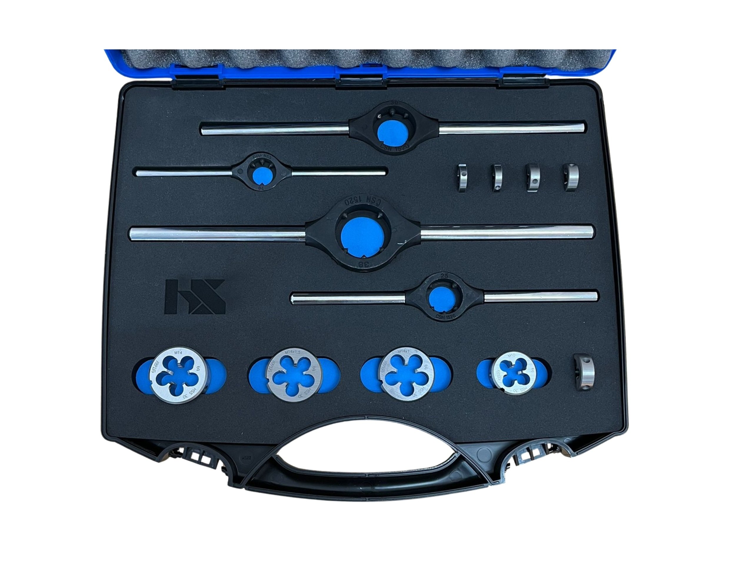 Sada 13 ks závitových kruhových čelistí a vratidel v praktickém plastovém kufru. Sada obsahuje závitové kruhové čelisti HSS 6g pro rozměry M3, M4, M5, M6, M8, M10, M14, M14×1 a M14×1,5, všechny s lamačem třísek, a čtyři vratidla pro závitové kruhové čelisti (20, 25, 30, 38). Po kliknutí na kód produktu je k dispozici podrobná specifikace jednotlivých položek.