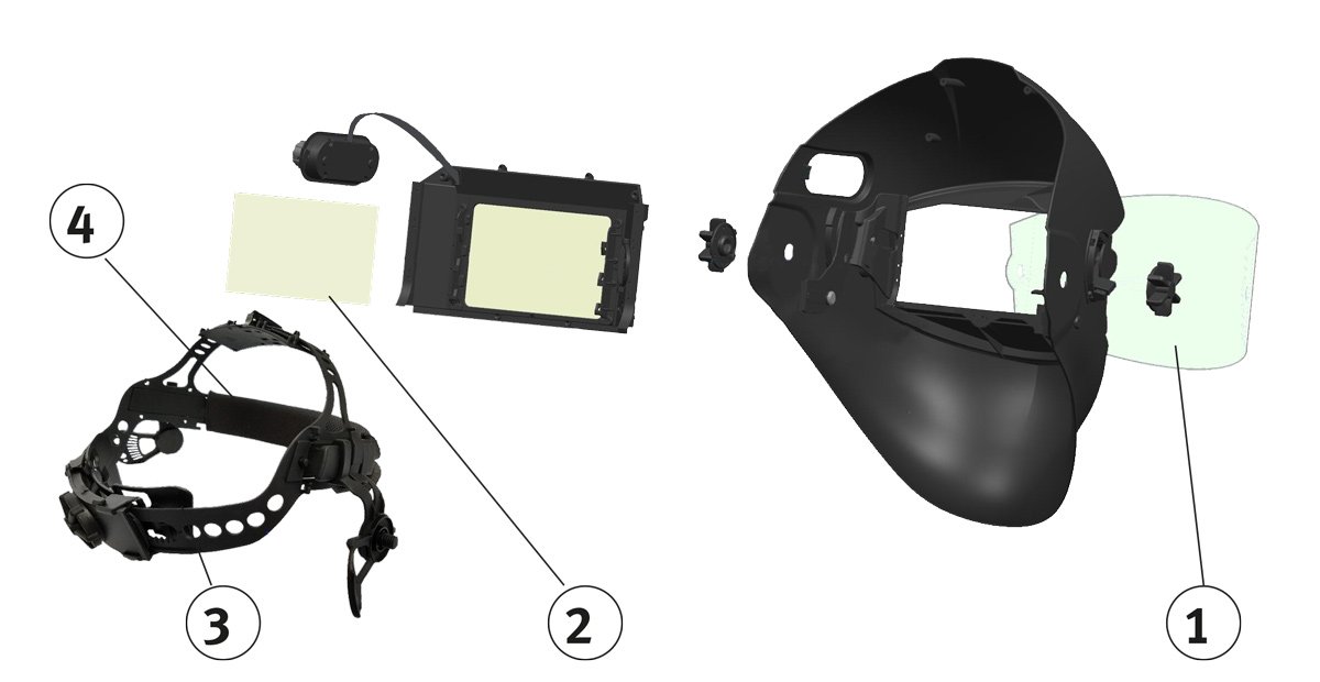 - Svařovací kukla je vybavena výklopným systémem: možnost vyklopení kazety nahoru, aby bylo možné např. při broušení sledovat práci přes čirý ochranný štít