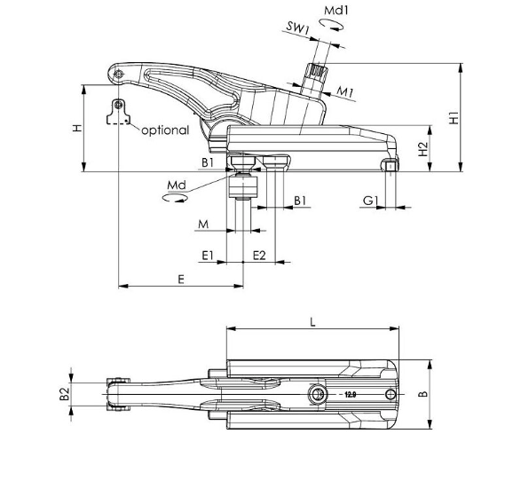 Plynule nastavitelný upínací prvek z legované kalené oceli s černým galvanickým povrchem. Dodává se kompletní s montážní sadou 7600BFS.