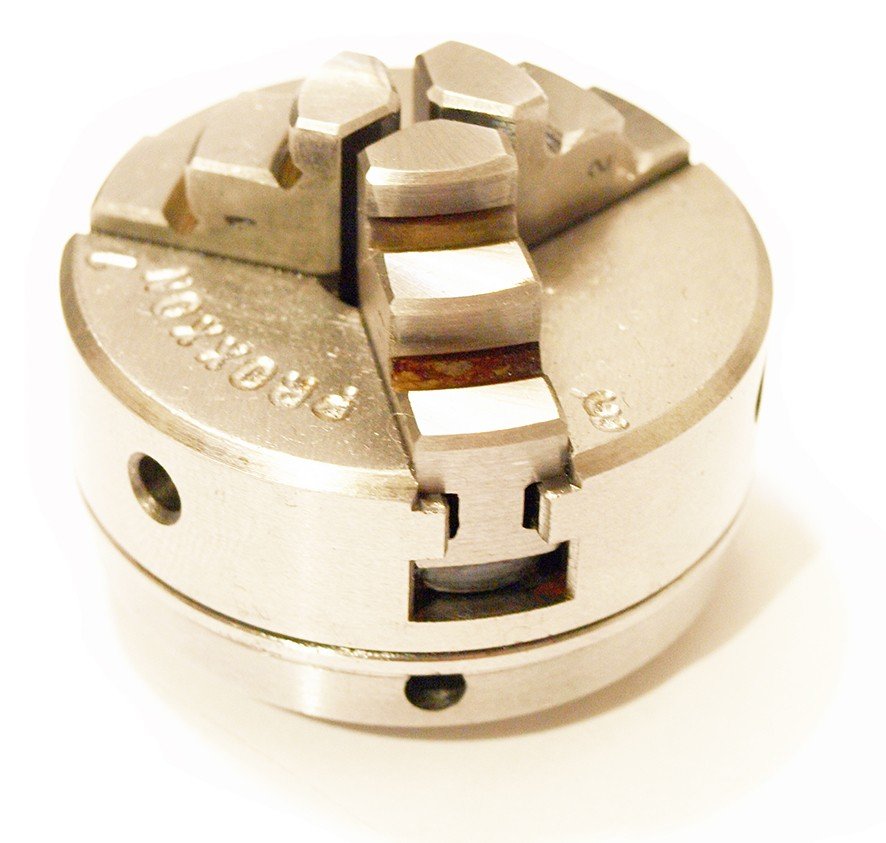Vysoce kvalitní 3-čelisťové sklíčidlo je centricky upínané na vřeteno soustruhu (vnitřní upínací rozsah čelistí 1,5 – 32 mm, vnější upnutí 12 – 65 mm), hloubka 35mm.