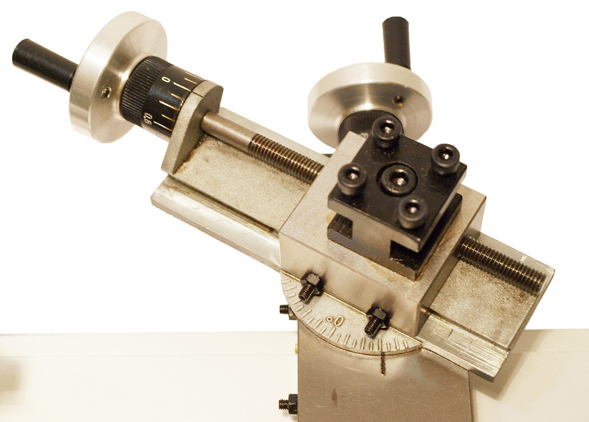 Příčné a horní saně jsou vyrobeny z oceli (rozsah seřízení příčné saně 40mm, horní saně 60 mm). Natočením horních saní je možno soustružit kužely do +/- 45°.