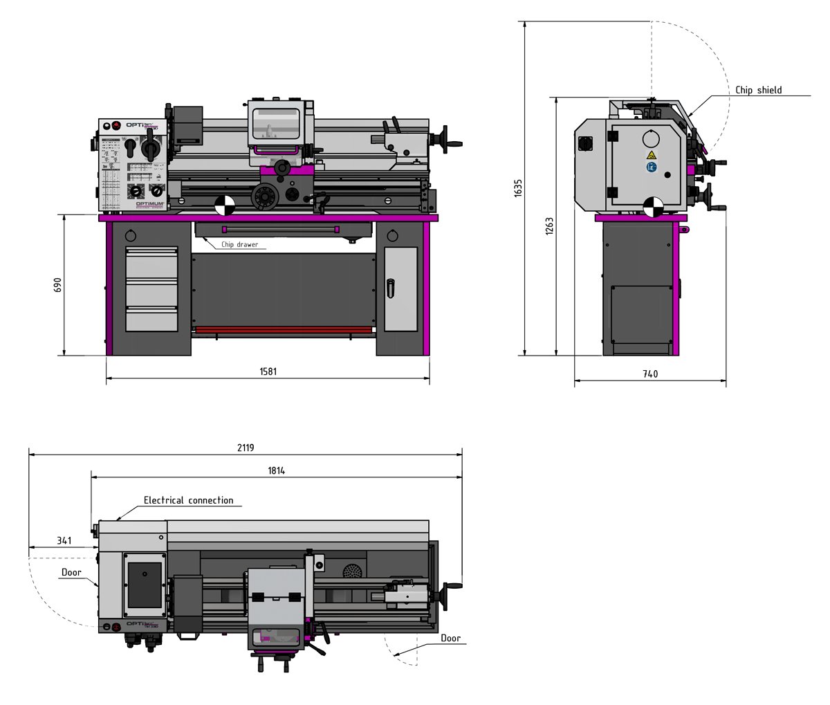 Plně vybavený soustruh s vodicím a tažným šroubem. Volitelně s plynulou regulací otáček pomocí frekvenčního měniče Lenze.