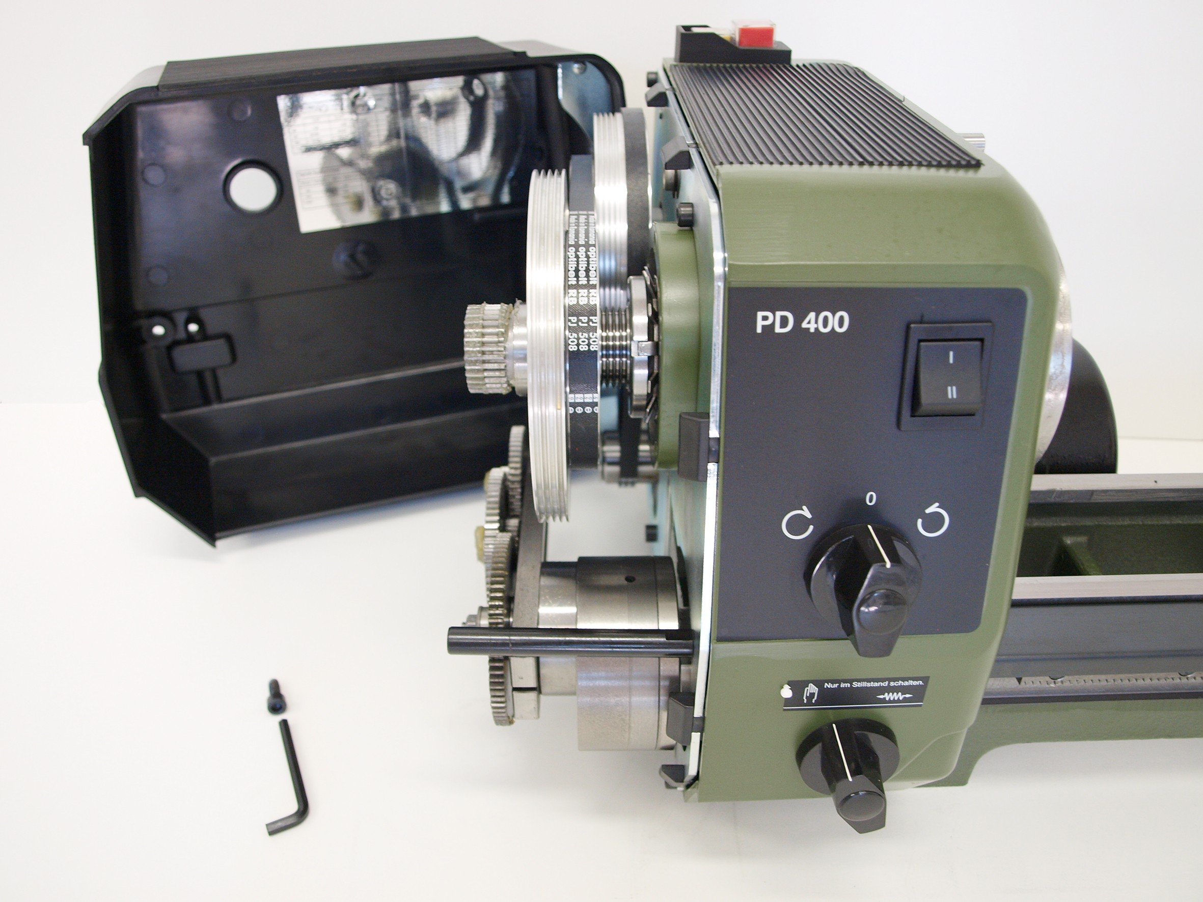 Montážní příruba pro upevnění vrtacího a frézovacího zařízení PF 230. Soustruh je poháněn silným tichým motorem s možností šesti rychlostí otáčení vřetene nastavitelných přesouváním hnacího řemene v rozsahu 80 - 2.800/min.