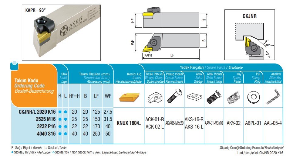 Držák je kompatibilní s ISO výměnnými břitovými destičkami typu KNUX. pro přechod na položku VBD KNU.. klikněte ZDE Více informací o kompletním sortimentu nástrojových držáků AKKO najdete na www.akko.cz. Níže ke stažení katalogový list ve formát JPG. Přiložené obrázky jsou ilustrační a náleží pravořeznému provedení držáku