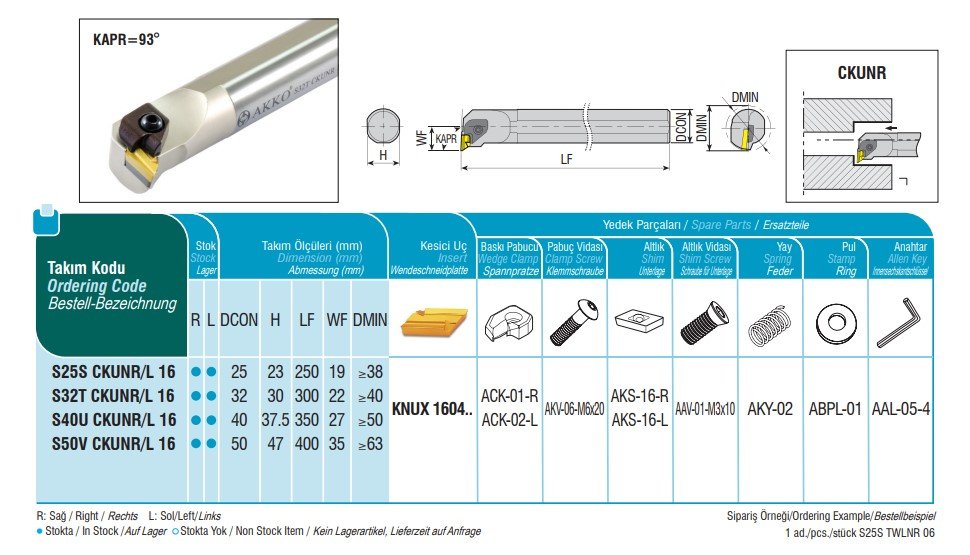 Držák je kompatibilní s ISO výměnnými břitovými destičkami typu KNUX. pro přechod na položku VBD KNU.. klikněte ZDE Více informací o kompletním sortimentu nástrojových držáků AKKO najdete na www.akko.cz. Níže ke stažení katalogový list ve formát JPG. Přiložené obrázky jsou ilustrační a náleží pravořeznému provedení držáku