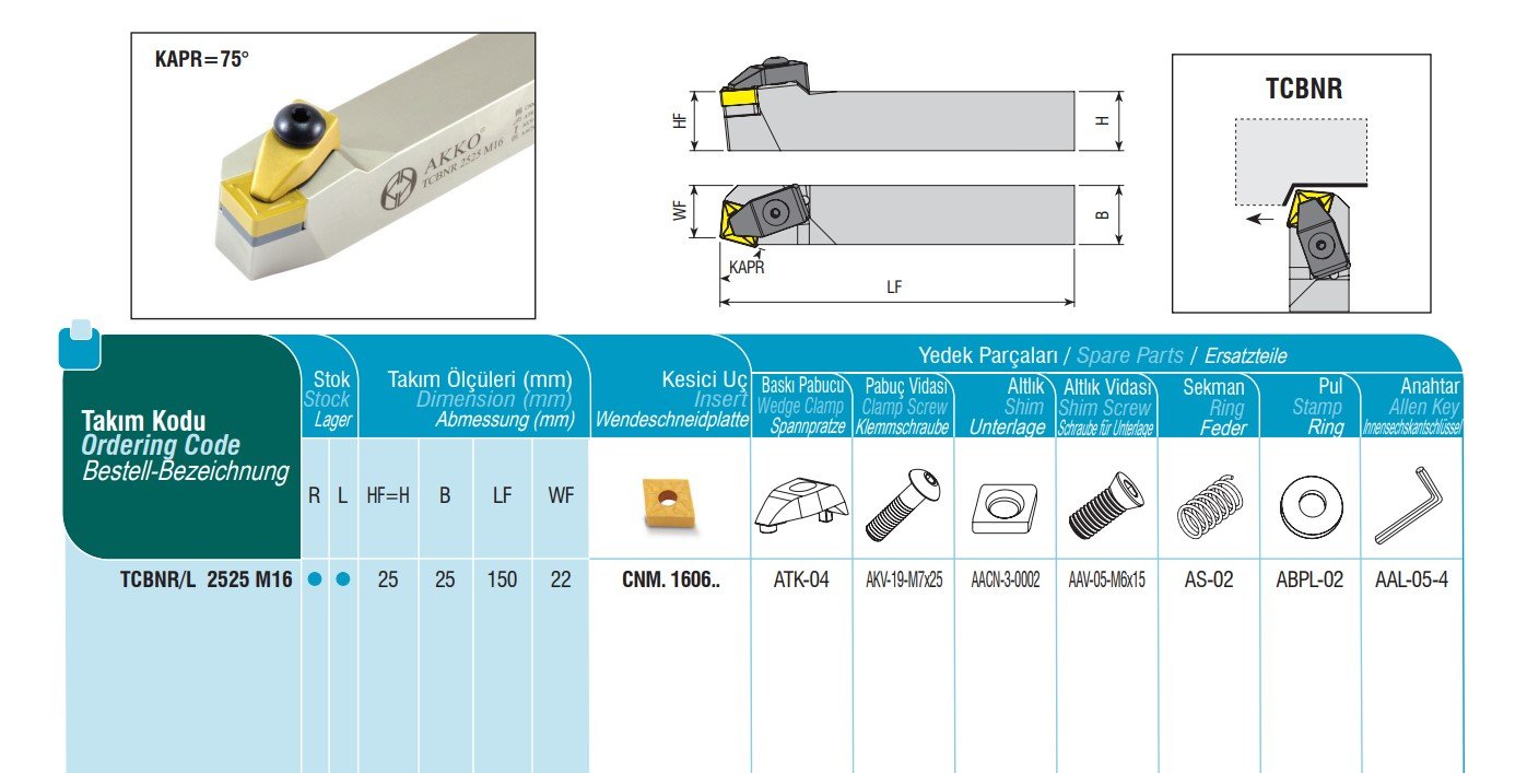 Držák je kompatibilní s ISO výměnnými břitovými destičkami typu CNM. 1606. Pro přechod na nákup výměnných břitových destiček použijte níže související produkty.Níže ke stažení katalogový list ve formátu PDF.Přiložené obrázky jsou ilustrační a náleží pravořeznému provedení držáku… Více