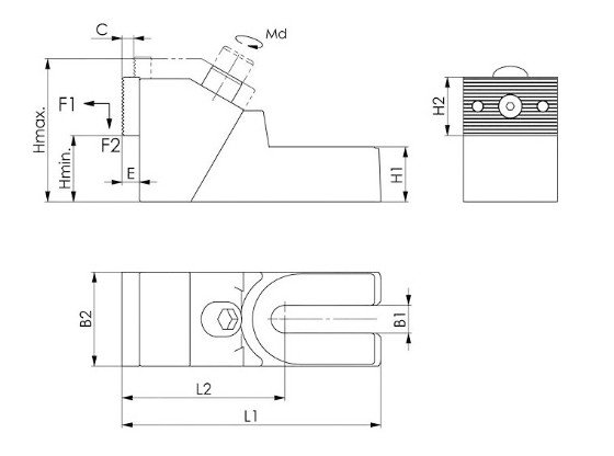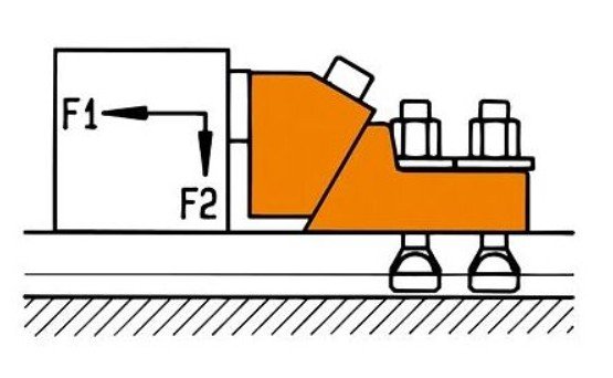 Extra silná upínací čelist s vysokým provedením a přesným prizmatickým vedením. Tělo je vyrobeno z tvárné litiny, upínací čelisti z cementační oceli, povrchově kalené. Oboustranné čelisti mají hladkou stranu pro obráběné obrobky a vroubkovanou stranu pro hrubé upínací povrchy. Upínací síly F1 a F2 jsou dosaženy při optimálním návrhu a využití maximálního utahovacího momentu upevňovacích šroubů.